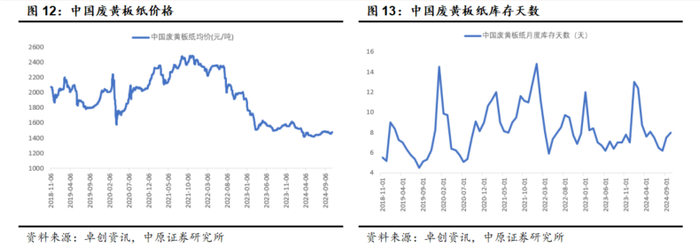 废黄板纸价格平稳,库存下降。2024年10月31日,废黄板纸均价为1477元/吨,较上月末上升0.41%,月内呈现先降后升趋势,整体较为平稳;2024年10月,废黄板纸库存天数为8天,环比增加0.5天,库存延续上升。