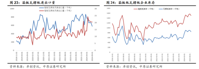 从进出口来看,主要为进口需求,进口量同比继续下滑,出口量同比持续增长。2024年9月箱板纸和瓦楞纸分别进口40.71、17.23万吨,合计进口57.94万吨,同比下降18.12%;分别出口1.22、0.83万吨,合计出口2.05万吨,同比增长83.83%。