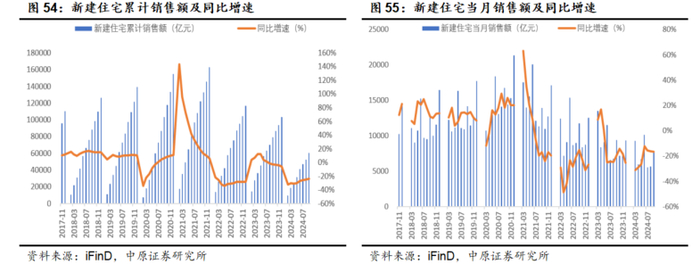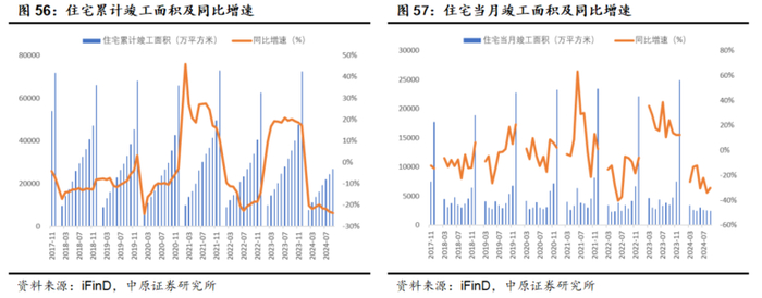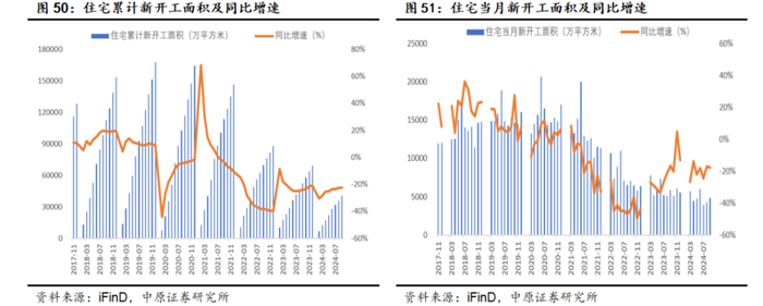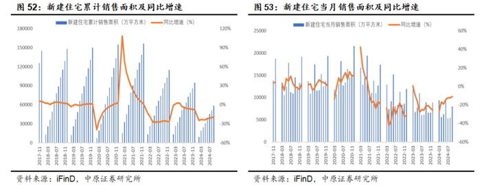 住宅累计、当月新开工面积仍为负增长,累计降幅连续两个月收窄,从绝对值来看,新开工面积处于历史低位,在新增土地供应减少以及销售去化周期拉长的情况下,新开工面积预计仍将延续下滑。2024年9月全国住宅新开工面积4836万平方米,同比下降17.69%,降幅环比略有扩大;1-9月全国住宅累计新开工面积40745万平方米,同比下降22.40%,降幅略有收窄。