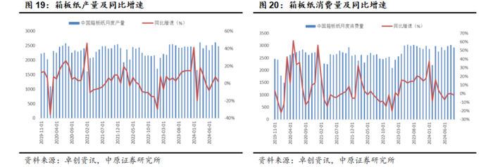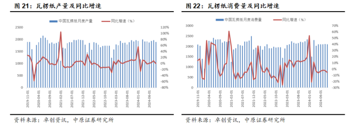2024年9月,瓦楞纸月度产量为190.18万吨,同比增长0.51%;2024年9月,瓦楞纸月度消费量为210.60万吨,同比下降5.24%。