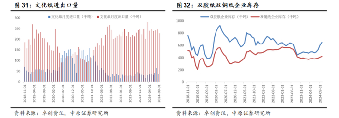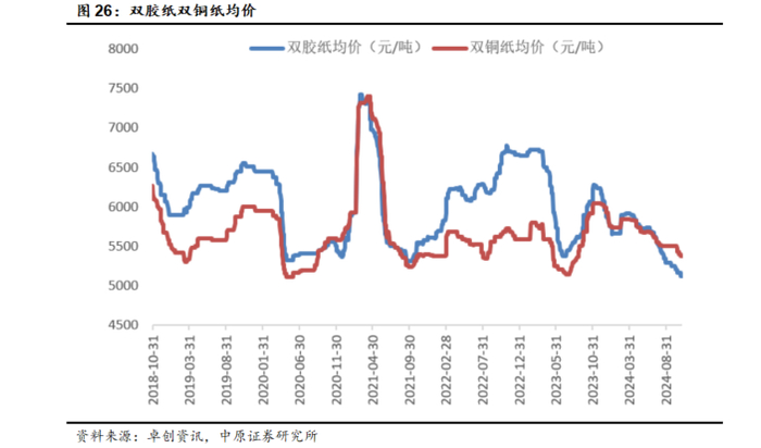 从价格来看,双胶纸、双铜纸价格继续下调,延续弱势,根据卓创资讯,主要由于下游跟单积极性有限,社会面暂未贡献显著订单增量,上游浆价月内震荡偏弱调整,成本端暂乏有力支撑。2024年10月31日,双胶纸、双铜纸价格分别为5125、5380元/吨,分别较上月末下跌2.38%、2.18%。