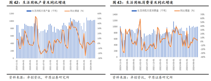 从产消情况来看,产销量同比均有增长,根据卓创资讯,产量增长主要由于一方面随着市场进入传统需求旺季,纸企出货顺畅,纸企开工积极性提升,另一方面随着纸浆价格下跌,成本压力略有缓解,带动部分纸企开工积极性提升。2024年9月,生活用纸月度产量为103.06万吨,同比增长2.18%;2024年9月,生活用纸月度消费量为100.29万吨,同比增长3.27%。