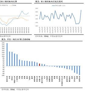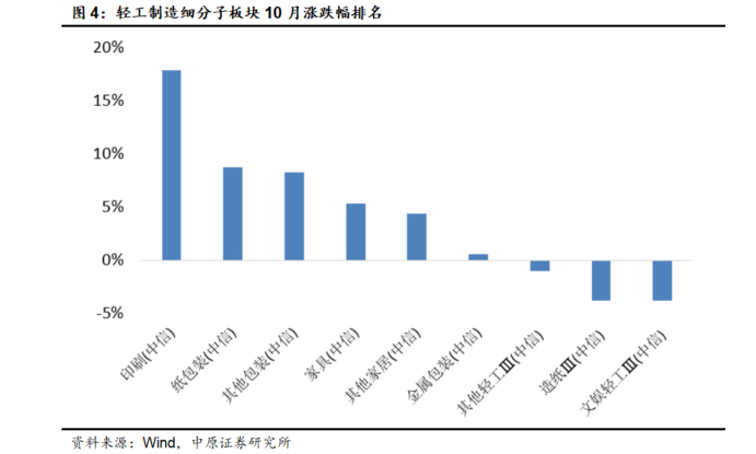 轻工制造各细分板块中,印刷、纸包装、其他包装表现相对较好,具体涨跌幅排名如下:印刷(17.89%)、纸包装(8.72%)、其他包装(8.28%)、家具(5.34%)、其他家居(4.35%)、金属包装(0.53%)、其他轻工(-1.04%)、造纸(-3.75%)、文娱轻工(-3.82%)。