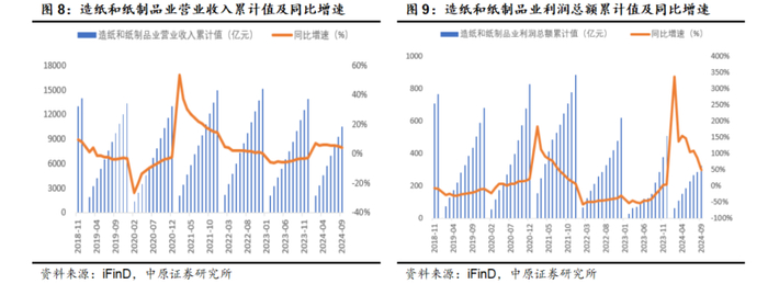 2024年1-9月,我国造纸和纸制品业规模以上工业企业营业收入累计10598.70亿元,同比增长4.4%,收入延续增长趋势,增速连续第4个月放缓;2024年1-9月利润总额累计325亿元,同比增长48.4%,利润延续增长,增速较上月下降。