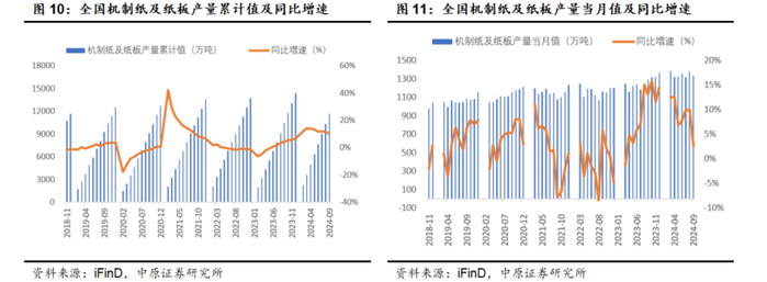2024年9月全国机制纸及纸板产量1333.34万吨,同比增长2.5%,1-9月产量11632.89万吨,同比增长10.2%,增速略放缓。