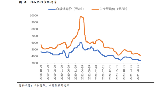 从价格来看,白板纸、白卡纸价格延续下滑趋势。根据卓创资讯,终端需求仍无起色,下游订单跟进一般,经销商备货意向不高,补库心态仍偏谨慎等导致白板纸价格下跌;市场供应整体过剩,纸厂部分库存处于高位,终端需求释放不足等原因导致白卡纸价格下跌。2024年10月31日,白板纸、白卡纸价格分别为3355、4146元/吨,较上月末价格下降1.83%、3.13%。
