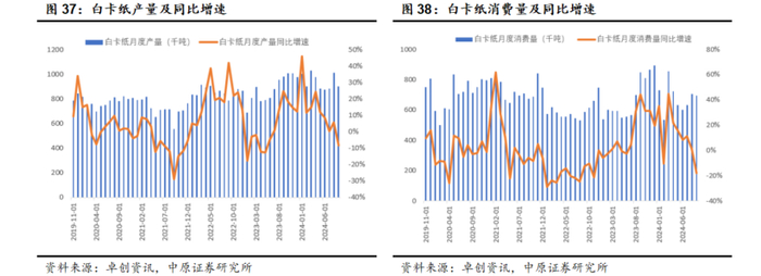 2024年9月,白卡纸月度产量为90.41万吨,同比下降8.18%;2024年9月,白卡纸月度消费量为69.60万吨,同比下降18.12%。