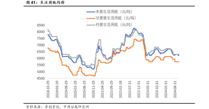 从价格来看,木浆生活用纸价格小幅下跌,甘蔗浆及竹浆生活用纸价格较上月底持平,木浆生活用纸价格下跌主要由于一是北方市场新增产能释放,二是华南市场受国产浆料低价供应导致下游采买积极性一般。2024年10月31日,木浆、甘蔗浆、竹浆生活用纸价格分别为6233、5750、6300元/吨,分别较上月末-1.06%、+0%、+0%。