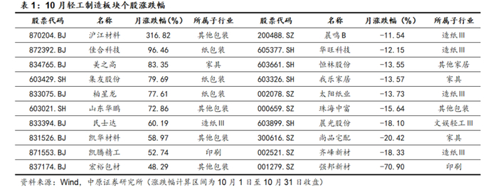 市场回顾:10月轻工制造板块上涨2.43%,跑赢沪深300指数5.59pct,涨幅在中信一级行业中排名第14名。本月个股超半数上涨,涨幅靠前的5名分别是沪江材料、佳合科技、美之高、集友股份、柏星龙。
