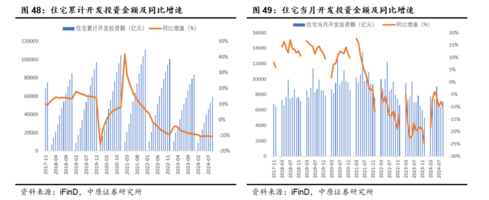 住宅累计、当月开发投资金额延续负增长,从绝对值来看仍在低位徘徊,投资意愿仍然低迷,近期国家和地方政策在销售端初显成效,但传递到开发投资端仍需时间。2024年9月全国住宅开发投资金额7074亿元,同比下降9.94%,降幅环比略有扩大;1-9月全国住宅累计开发投资金额59701亿元,同比下降10.50%,降幅环比持平。
