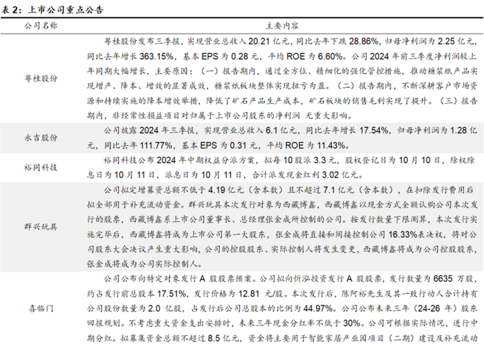 投资建议:截至2024年10月31日,板块的PE(TTM)为30.31倍,处于近十年41.63%分位;细分子板块家居、文娱轻工、其他轻工的PE估值水平分别位于历史32.77%、36.22%、7.23%分位,估值仍处于历史偏低水平。维持行业“同步大市”投资评级,建议关注造纸板块具备林浆纸一体化优势的头部企业太阳纸业,以及特种纸企业仙鹤股份、华旺科技,关注家居板块相关龙头企业欧派家居、索菲亚、公牛集团,以及受益于外需提升的相关家居出口链企业致欧科技、乐歌股份。