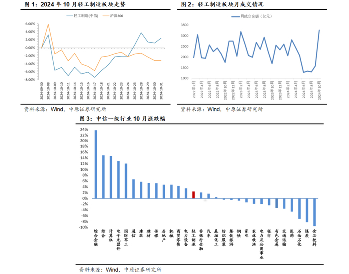 2024年10月,上证指数下跌1.70%,沪深300指数下跌3.16%,中信轻工制造行业指数上涨2.43%,跑赢同期沪深300指数5.59pct,在中信30个一级行业中排名第14名,涨幅排名居中。轻工制造板块10月成交额3265.76亿元,环比显著放量,日均成交额181.43亿元,环比提升118%。