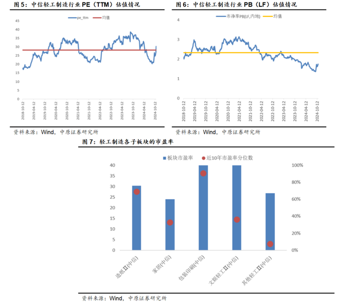 截至2024年10月31日,板块的PE(TTM)为30.31倍,处于近十年41.63%分位,在30个中信一级行业中排在第14位;PB(LF)为1.75倍,处于近十年6.17%分位。细分子板块造纸、家居、包装印刷、文娱轻工、其他轻工的PE(TTM)分别为30.42/24.03/41.12/43.21/26.92倍,分别处于历史68.77%、32.77%、90.76%、36.22%、7.23%分位,其中家居、文娱轻工、其他轻工估值仍处于历史偏低水平。