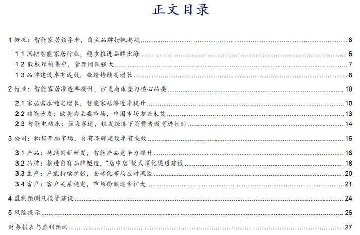 全球智能电动沙发、智能电动床行业重要ODM供应商,并积极开拓自主品牌。公司秉承“让智能家居奢而不贵,无所不在”的使命,坚持创新、环保、安全、健康的设计理念和制造标准,深耕美国及国际市场多年,是全球智能电动沙发、智能电动床行业重要的ODM供应商。凭借优秀的设计研发、卓越的产品品质和可靠的售后服务,公司已经与 Ashley Furniture、Pride Mobility、HomeStretch、Raymours Furniture、R.C. Willey 等国际知名家具企业建立了良好的长期业务合作关系。同时,公司拥有MotoMotion、MotoSleep、MotoLiving、HHC、Yourway等具有一定国际知名度的自主品牌,大力开展自主品牌业务。截至2024H1,公司已在美国零售商客户的门店内建成了100多个小规模的店中店,迈出了“在海外建设自主品牌”的第一步。