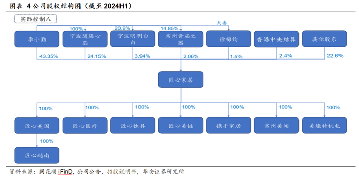 公司股权结构集中。公司董事长、实际控制人为李小勤,其直接持有公司43.35%的股份,并通过宁波随遇心蕊、宁波明明白白、常州清庙之器持有公司股份,其配偶徐梅钧直接持有1.50%的股份并担任公司副董事长、总经理。公司各子公司各司其职,匠心美国服务于最重要的美国市场,孙公司匠心新加坡主要开拓东南亚RCEP国家,匠心越南负责公司主要涉税产品生产及出口,携手家居、美能特机电分别负责结构件、电机生产。