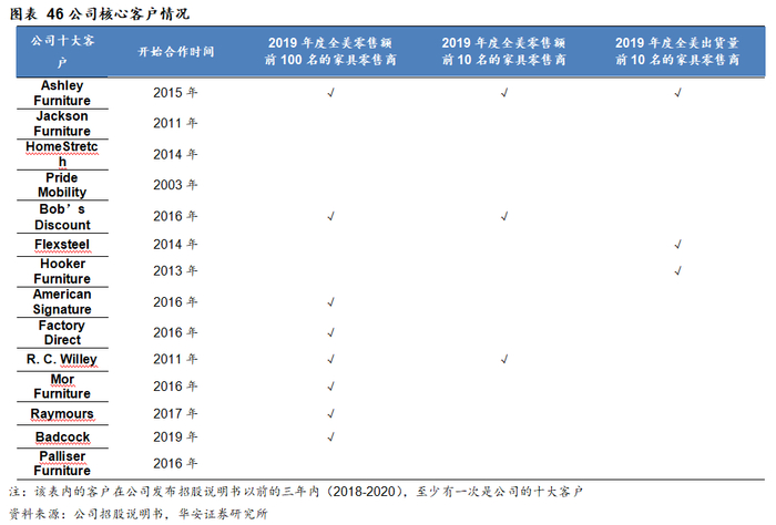 先进技术获得认可,建立良好市场声誉。《Furniture Today》杂志发布的2019年度全美家具零售商销售百强榜单中,有20家为公司客户,均为家具零售领域的佼佼者,具备成熟的经营体系和雄厚的资本实力,对供应商的选择标准极为严格,且一旦确立合作关系,倾向于长期稳定合作,不轻易更迭。在公司近三年的主要客户名单中,多数客户的合作历史已超过五年,公司与客户关系稳定,业务量持续增长。公司在维护现有客户关系的同时,亦不断通过自身在行业内的专业实力和品牌影响力,积极拓展新的业务机会。例如,2019年公司与Badcock建立合作关系,首年合作即实现营业收入1568.02万元。随后在2020年,电动床产品的销售金额进一步增长至1744.01万元,占公司当年营业收入的1.33%。公司对现有客户的深度服务与对新客户资源的不断开发,共同构成了公司业务持续增长的双重动力,为公司的长期发展和市场竞争力提供了有力支撑。