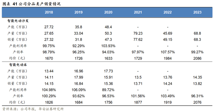 产销量持续增长,产能利用率及产销率维持高位。2023年,公司智能电动沙发和电动床的产量分别为68.80万件和14.35万件,销量分别为68.36万件和13.82万件,产销率分别为99.27%和96.31%。公司持续改善产品结构,提升高附加值产品和自有品牌占比,比如智能电动沙发由单人沙发品类拓展至组合沙发,智能电动床拓展至快运床与超薄床等。随着公司高附加值产品占比增加,公司各产品均价持续增长,2018-2023年公司智能电动沙发均价由1670元上涨至2086元,智能电动床均价由1826元上涨至2076元。