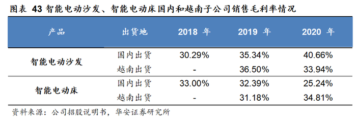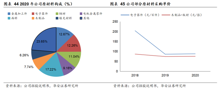 原材料成本占比约为76%。根据公司招股说明书,2020年,公司智能电动沙发和智能电动床的原材料成本占比高达76%。进一步拆分原材料构成,面料、金属加工件、电子器件、钢材、电机金属零件、木制品和填充材料的占比分别为17.22%、12.67%、12.26%、11.04%、9.16%、7.74%和6.26%。公司通过自主生产核心配件,显著降低了采购成本,并通过优化生产流程、减少材料浪费和提高材料利用率,进一步提高了生产效率。