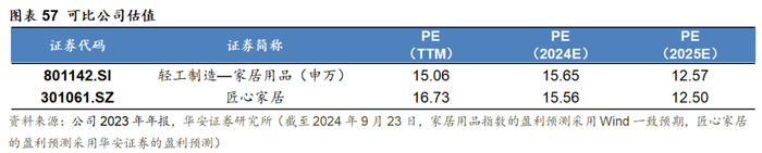 按照申万二级行业分类,公司所属行业分类为“轻工制造—家居用品”,我们选取申万二级行业分类家居用品下的所有上市公司作为可比公司,采用PE估值法对其进行估值。采用2024年9月23日收盘价,根据Wind一致预期,家居用品公司的PE(TTM)/PE(2024E)/PE(2025E)分别为15.06/15.65/12.57倍,匠心家居的PE(TTM)/PE(2024E)/PE(2025E)分别为16.73/15.56/12.50倍,PE(2024E)和PE(2025E)低于可比公司平均值。首次覆盖,给予“买入”评级。