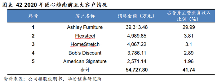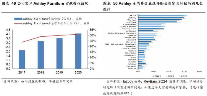 与Ashley Furniture深度合作,有望共同成长。Ashley Furniture作为美国顶尖家具企业之一,自2017年至2020年连续四年稳居公司第一大客户之位。在此期间,Ashley Furniture为公司带来的营业收入逐年增长,分别为2.12亿元、3.15亿元、3.51亿元及4.05亿元,复合年增长率达到24.04%,占公司总营业收入的比例分别为23.71%、28.73%、29.90%、30.75%。公司与Ashley Furniture的深度合作关系,确保了营业收入的稳定增长,预计随着Ashley Furniture市场拓展的加速,公司订单量将逐步增加,实现共同增长。