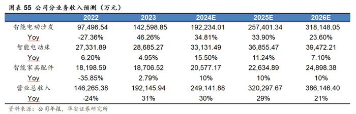 (2)智能电动床:随着智能电动床产品逐步普及,消费者对于产品的接受度提升,市场渗透率提升,公司有望享受行业增长机会。我们预计2024-2026年公司智能电动床业务收入增速为16%/11%/7%,毛利率为37.0%/37.1%/37.2%。