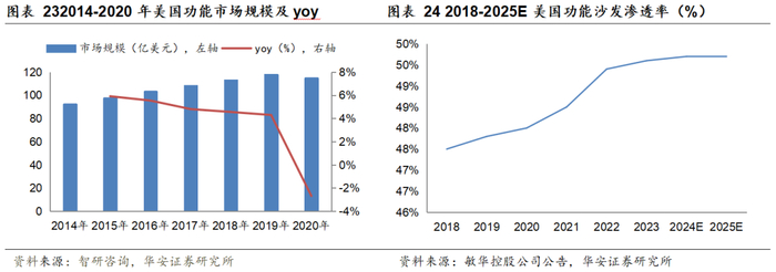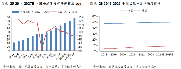 美国功能沙发渗透率高,市场规模稳定增长。美国作为功能沙发的发源地,由于长时间用户教育+高人均可支配收入,功能沙发占据主流市场,根据敏华控股公告,2024年,美国功能沙发渗透率预计为49.7%,较2018年提升2.2pcts。根据智研咨询数据,美国功能沙发规模从2014年的92.37亿美元增长至2020年的114.83亿美元,CAGR为3.69%,整体呈稳定增长趋势。