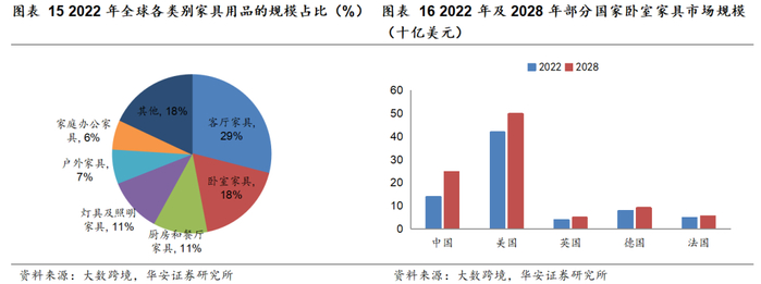 客厅家具和卧室家具为前两大家具品类。按场景划分,家具分为客厅家具、厨房和餐厅家具、家庭办公家具、卧室家具、户外家具、灯具和照明等。其中,客厅家具占据了最大的市场份额,根据大数跨境,2022年市场规模为2147亿美元,占整个家具市场的29%,预计到2028年将增长至2850亿美元,2023-2028年的CAGR为5.83%。美国是客厅家具的主要市场,2023年的市场规模为680.7亿美元,人均客厅家具消费额为27.95美元。卧室家具市场位居次席,2022年市场规模为1313亿美元,占整个家具市场的18%,随着消费者对家居生活品质和舒适度的要求不断提升,卧室家具作为提升居住体验的关键要素,市场前景广阔。