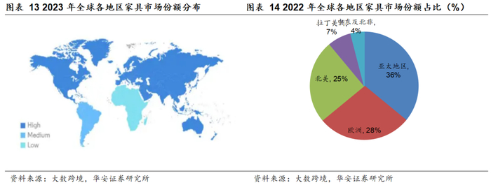 全球家具需求持续增长,欧美市场发展成熟。根据大数跨境数据,2024年,全球家具市场规模预计为7662亿美元,并将持续增长,2024至2028年的CAGR为5.02%。分地区来看,2022年,亚太地区/欧洲/北美分别占据家具市场36%/28%/25%的市场份额,亚太地区是家具产品的最大市场,欧美地区是高度成熟的市场,居民有较高的收入水平和消费水平,对高品质、人体工程学和美观设计的家具有着强烈的需求。