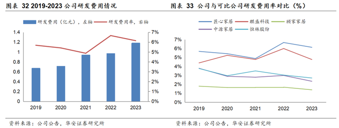 积极进行研发投入,研发费用率行业领先。公司重视研发,每年投入大量的人力、物力和财力用于全新产品的开发。经过多年的发展,公司拥有较强的自主设计和创新能力,公司及子公司携手家居、美能特机电均为高新技术企业;公司先后被江苏省工业和信息化厅等部门评定为“江苏省认定企业技术中心”、“江苏省认定工业设计中心”。公司2023年研发费用为1.18亿元,研发费用率为6.14%,在行业内处于领先水平。公司研发费用率维持在6%左右,与公司营业收入的高增速相匹配,2019-2023年公司研发费用率年复合增速达15.2%。