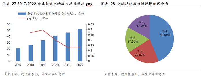 智能电动床蓝海赛道,欧美国家市场需求旺盛。智能电动床通过多种高科技硬件技术使床具有多区域调节控制床板曲线、震动按摩、蓝牙音箱、睡眠监测、遥控及 APP 控制等功能,未来发展前景广阔。根据观研报告网数据,全球智能电动床市场规模2017年的20.57亿美元增长到2022年的52.07亿美元,CAGR达20.41%。美国是全球最大的智能床消费国,市场占比44%,智能电动床市场渗透率约为14%;亚太地区为智能电动床第二大消费市场,市场占比22%;此外,欧洲地区智能电动床市场占比17%。