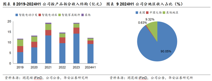 智能电动沙发为核心经营产品,美国为核心经营区域。分产品看,智能电动沙发为主要产品,2019-2023年,智能电动沙发收入由5.49亿元增长至14.26亿元,CAGR为27%,2024H1占总收入比例为77%;智能电动床收入从2.84亿元增长至2.87亿元,CAGR为0.26%,收入较平稳,2024H1占总收入比例为13%。分地区看,公司产品主要出口销往境外,2024H1来自国外市场的收入占比为99%,其中,来自美国市场的收入占比为90.05%。