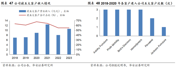 下游合作关系稳定,前五大客户占比较大。2018-2023年,公司前五大客户累计贡献的营业收入呈增长趋势,分别为6.95亿、7.12亿、8.91亿、12.36亿、8.03亿和10.53亿元,占总营业收入的比例在54.78%至63.40%之间波动。2020年,Ashley Furniture、Pride Mobility、Bob’s Discount、HomeStretch和Flexsteel位列前五大客户,分别贡献了30.75%、15.75%、7.57%、7.45%和6.07%的营业收入。2018-2020年,Aheley Furniture等客户中有四家三年均位居前五,反映了客户对公司产品和服务的高度认可及合作关系的稳定性。