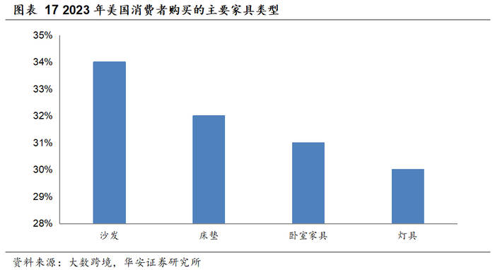 美国市场消费者偏好舒适性家具,看重品牌知名度。2024年,沙发、床垫和卧室家具分别以34%、32%和31%的市场份额,占据美国消费者主要购买家具产品的前三位。在产品类型偏好上,消费者特别注重家具的舒适性与实用性,根据Statista数据,2022年,美国消费者在家具上的年均支出约为746美元。其中沙发和床垫在消费者支出中占据了前两位,各自超过30%的市场份额。美国消费者会根据品牌的知名度来做出选择,55%的消费者会认为知名品牌的家具质量更可靠、设计更优秀或服务更周到。