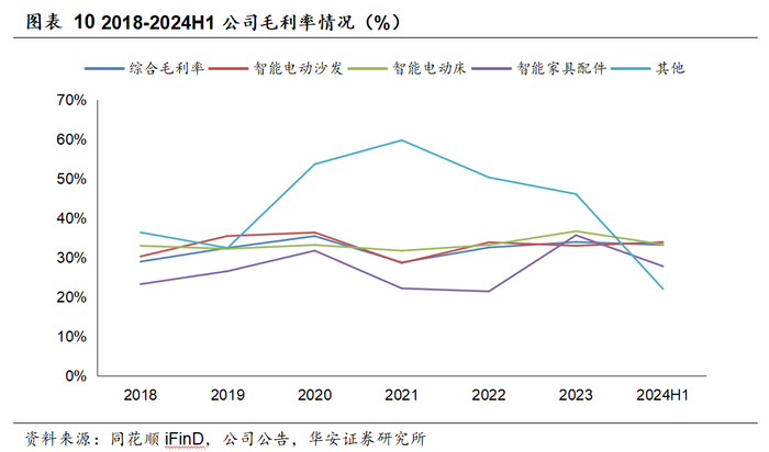 产品结构优化,毛利率呈提升趋势。一方面,公司积极优化产品结构,低附加值、低毛利率的智能家具配件收入占比持续下降,高附加值、高毛利率的智能电动沙发及智能电动床收入占比提升;另一方面,随着公司销售规模的不断扩大和品牌影响力的提高,规模效应显现。公司综合毛利率由2018年的28.98%提升至2024H1的33.22%。随着公司产能提高,规模效应陆续兑现,公司生产的自动化、柔性化水平提升,市场开拓能力增强,预计毛利率有望进一步提升。