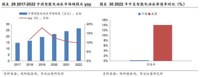 银发经济下国内智能电动床消费者教育进行时,渗透率有广阔提升空间。随着我国老龄化程度的加深,老年人口对健康管理和生活质量的需求日益增加。智能电动床凭借其健康监测、便捷护理和舒适体验等优势,正逐渐成为银发经济下的生活必备品。根据观研报告网数据,中国智能电动床市场规模2014年的14.68亿元增长至2022年的26.42亿元,CAGR为12.47%。中国市场对于智能电动床的认知度较低,2022年渗透率仅为0.2%,与美国等成熟市场相比,伴随消费者教育不断推进,叠加国内消费升级,市场渗透率有望逐年提高。