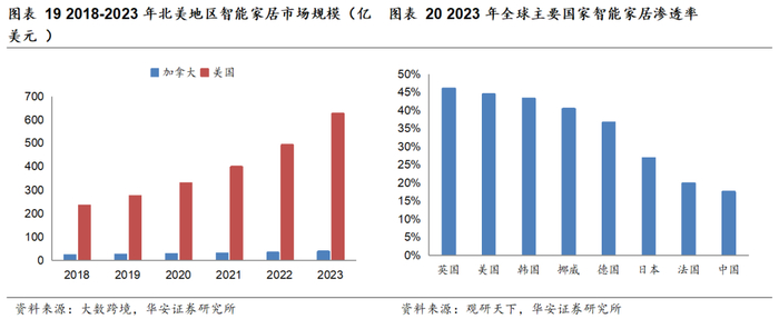 智能家居市场潜力较大,发展空间广阔。根据大数跨境数据,2023年,全球智能家居市场规模为1010.7亿美元,并预计从2024年的1215.9亿美元增长至2032年的6332.0亿美元,CAGR为22.9%。在一些发达国家,智能家居产品的市场渗透率较高,根据观研天下数据,2023年,英国/美国/韩国/挪威/德国/日本/法国/中国的智能家居行业渗透率分别为46.1%/44.5%/43.3%/40.5%/36.7%/26.9%/19.9%/17.6%。特别是在年轻一代中,智能家居产品逐渐成为新房装修的标配,市场接受度较高。市场需求的不断增长,将为智能家居企业提供广阔的发展空间和较大的商业机会。