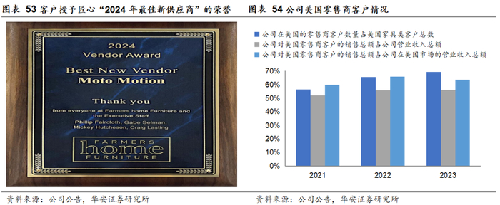 1)产品:公司重视研发,团队从外观、功能、材料到品质,全方位洞察并满足客户的个性化需求,每年都有突破性的产品问世。截至2023年6月底,公司共拥有620项境内外授权的专利及215项尚在申请中的专利。2)品牌:公司拥有MotoMotion、MotoSleep、MotoLiving等自主品牌,自2023年起,公司采取了创新的“店中店”模式,成功将产品和品牌引入零售终端市场。截至2024H1,公司已在美国零售商客户的门店内建成了100多个小规模的店中店,迈出了“在海外建设自主品牌”的第一步。3)生产:公司目前在常州和越南拥有两大生产基地,公司于2019年投产匠心越南,公司出口美国的家具产品目前均在越南生产,公司全球化的产能布局,在合理规避关税、反倾销税和反补贴税的同时,也维持了公司可持续经营能力。4)客户:一方面,公司与Ashley Furniture等头部公司深度合作,随着这些客户市场拓展的加速,公司订单量将逐步增加,实现共同增长。另一方面,公司加大开拓美国市场的投入和力度,零售新客户对增量贡献明显,2024年1-6月,公司一共获得49位全新客户,全部都是零售商。