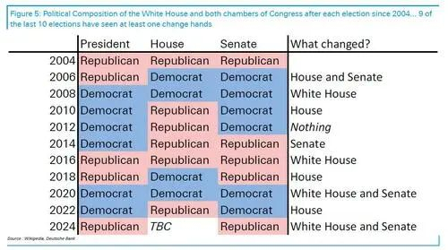 Allen指出,请记住,美国政局近年来非常不稳定:在过去10次总统大选/中期选举中,有9次白宫/参议院/众议院至少有一个控制权发生了变更。因此,政治格局的变化速度可能比许多人预期的要快。
