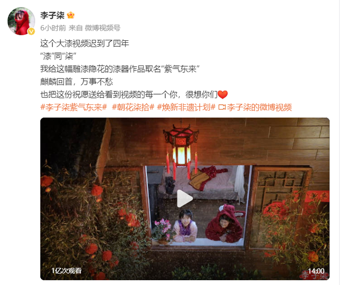 截至12日22:50,该视频在微博平台播放量达到1亿。当前李子柒微博认证为“李子柒品牌创始人”。
