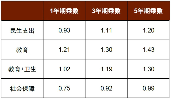 那财政如何提振需求?中国过去“稳增长”的一个重要抓手是基建,但经历多年高速发展后,基建增长空间收窄,政府投资乘数下降,我们测算政府投资的短期(一年)财政乘数可能已从2013-2017年的1.4左右降至2018-2022年的0.8左右,一个现象是基建固定资产投资与上市建筑公司营收之间的背离加大(图表16)。此外,投资短期提振需求,但中期也提升供给,可能导致需求缺口扩大而不是缩小,物价可能先升后降。因此,我们认为,政府支出重点由基建投资向民生转变有助于财政政策提质增效,同时也有助于持续地提振物价。我们的研究显示,不同领域的民生支出对经济增长的乘数差异较大,教育、医疗、社保三大民生一年内的短期乘数总体上可能为0.7-0.9,但长期乘数大于1(图表17)。细分来看,短期内教育乘数大于1,而卫生和社会保障短期乘数小于1,这可能是因为前者支出更为刚性。针对消费倾向较高(财政乘数较大)人群的民生政策可能更容易提振增长。我们认为,按照这个逻辑,针对低收入人群、年轻人和多孩家庭的民生政策或在稳增长方面效果更佳。比如,为了有效促进居民消费,提高对乡村老人、育儿家庭、城镇失业者和住房困难者的社会保障支出和相关民生支出可能比较有效。