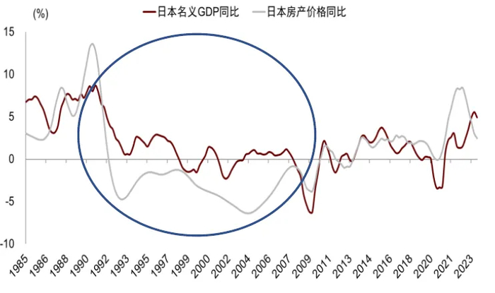 此外,是不是先要房价上升,经济才回暖呢?现实中的实际情况通常是,在房地产进入下行周期的过程中,房价调整领先经济增长,而在房地产止跌回暖的周期中,经济增长领先于房价回暖,美国和日本的经验见图表14-15。因为房价上升的前提是信贷扩张,而居民借钱购房的动机强弱与收入增速紧密相关。一般来说,经济增长回暖,居民收入预期改善,居民加杠杆的动力才可能增强,从而推升房价上升。也就是说,在财政政策发力稳增长、提升收入预期的情况下,居民加杠杆买房的动机才上升。当然,财政发力直接提升增长和财政加大力度稳地产并不矛盾,若可以同时进行,这样增长与地产改善的节奏将更快。