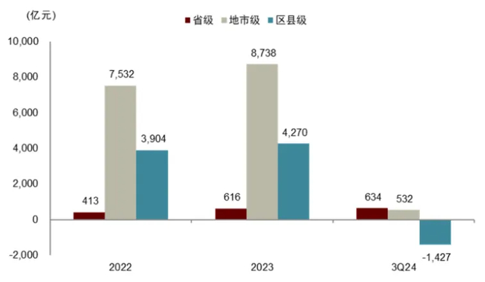 在降低广义财政还本付息负担方面,债务置换可以发挥比较突出的作用,2024年11月8日全国人大常委会表决通过关于批准《国务院关于提请审议增加地方政府债务限额置换存量隐性债务的议案》的决议[7]。2018-2023年间没有进行大规模债务置换,加上近几年土地出让收入下降较多,地方财力面临的挑战加大,财政逆周期调节能力受到影响。2015-2018年期间地方政府发行了较大规模的置换债来化解2014年认定的隐性债务,而2018年以来的新一轮化债则更多依赖地方政府和城投自有收入、占用新增专项债、盘活资产等方式偿还,这可能导致部分本应用于公共服务和投资的资金被用于还债。