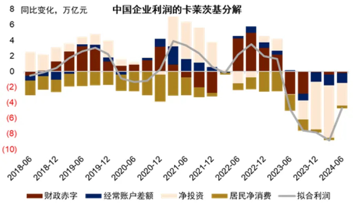 2021年以来,A股上市公司亏损面(亏损企业数占总企业数比重)有所扩大,2021-2024年,上半年税息折摊前利润(EBITDA)亏损的上市企业占比有所上升。从部门平衡的角度来看,企业利润的来源有四个,包括财政赤字、居民净消费、企业净投资和对外顺差。企业利润同比变化的分解显示,2023年2季度,财政赤字的变化对企业利润的影响较大,企业部门的投资对企业利润影响不大。但这个现象近期出现变化,净投资成为2024年企业利润最大的影响因子(图表8),这可能说明企业部门自身的紧缩已经成为影响企业利润的重要因素。