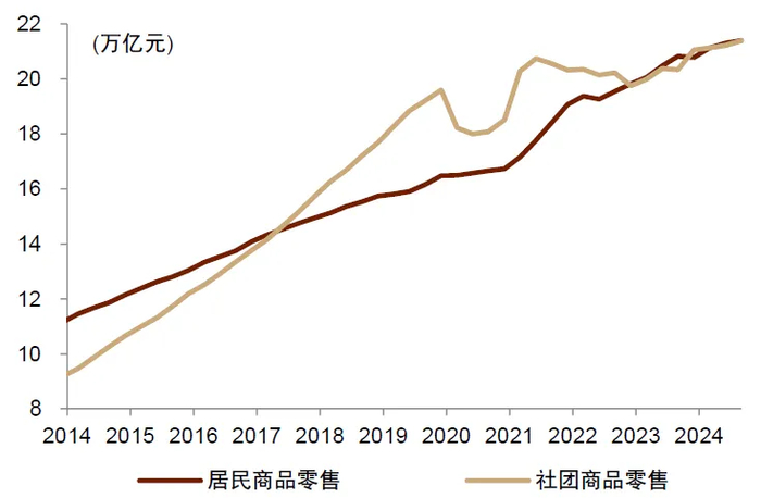 政府部门需求放缓既体现为投资放缓,也体现为社会集团零售走弱。城投债券净融资有所收缩,分行政层级看,区县级城投债券净融资受到的影响相对更大(图表6)。不过,城投债券融资走弱部分也可能由于基建投资空间的收窄所致。消费方面,GDP项下的消费包括商品消费和服务消费,而社会零售主要包括商品消费。近年来,居民零售增速偏弱,但社会集团零售下行相对更快(图表7)。