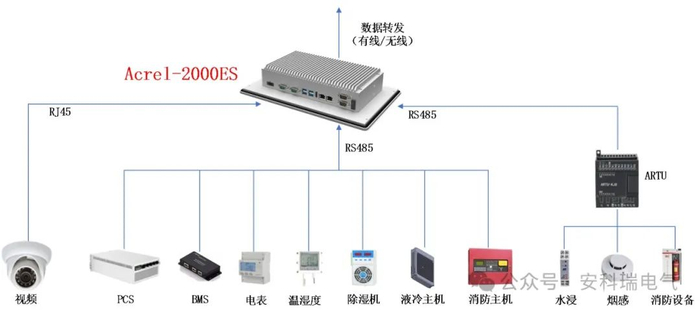 Acrel-2000ES,可通过直采或者通过通讯管理机或串口服务器将储能柜或者储能集装箱内部的设备接入系统。系统结构如下: