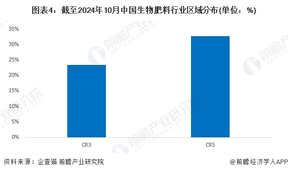 据企查猫统计数据,截至2024年10月,全国共有存续、在业生物肥料产业相关企业超7万家,其中山东省生物肥料企业数量最多,超1万家。生物肥料区域集中度CR3为23%;CR5为33%。