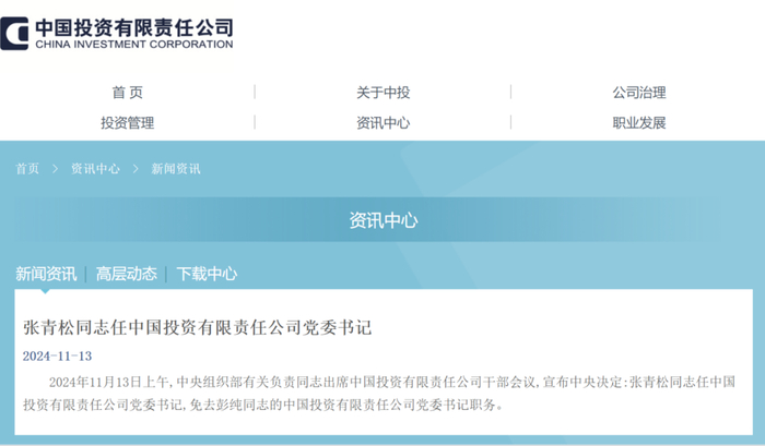 11月13日,中国投资有限责任公司(以下简称中投公司)官网显示,张青松同志任中国投资有限责任公司党委书记。