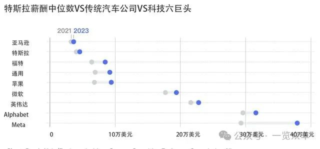 BI将该公司的基本工资中位数与传统汽车制造商和市值最大的六家科技公司进行了比较,结果显示,特斯拉落后于除亚马逊以外的所有公司。根据2021年的SEC文件,特斯拉员工的薪酬中位数约为4万美元。2023年特斯拉员工的薪酬中位数为4.6万美元,只高于亚马逊的3.6万美元。