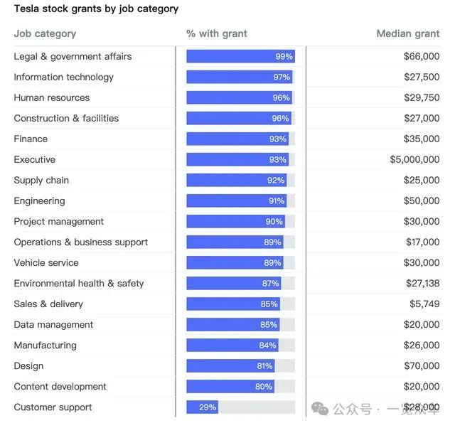 为了了解哪些员工更有可能获得大额股票奖励,《商业内幕》根据职位类别对股票奖励进行了分类。数据显示,大多数工程部门的员工获得的股票奖励超过了2.5万美元。这些股票的价值取决于特斯拉授予员工时的股价,但会根据特斯拉股价的变化而波动。