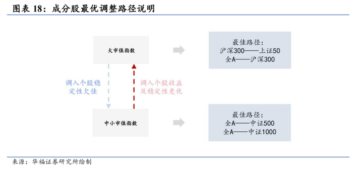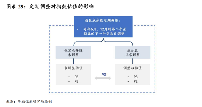 指数成分股的调整会对指数估值产生影响:大市值指数成分股调整抬升指数估值,中小市值指数成分股调整指数估值下降且调整幅度大于大市值指数估值的调整幅度。